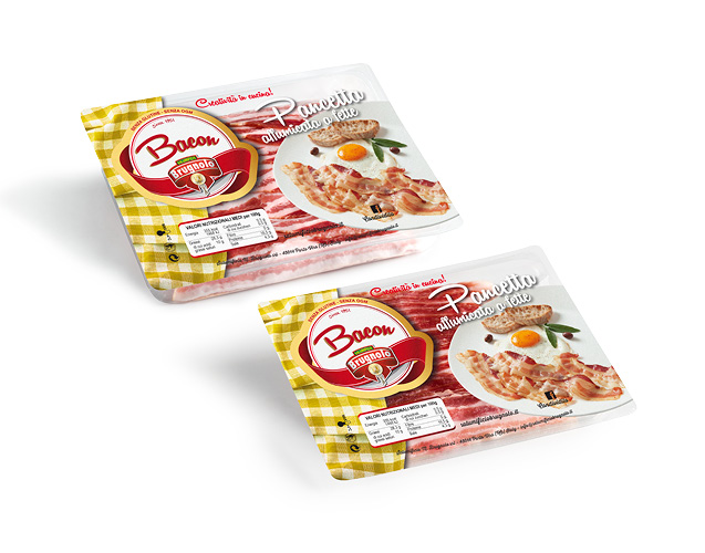 Pancetta di suino, salata, aromatizzata a crudo, asciugata e affumicata. Affettata in fettine sottili e confezionata in atmosfera protettiva in vaschette termosaldate.