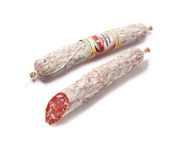 Salame di puro suino ottenuto da carni selezionate e macinate a grana medio-grossa ed insaporito con sale e pepe. Dal gusto saporito e delicato, resta morbido e rosato anche a fine stagionatura. Il formato ridotto lo rende adatto ad essere consumato in ogni occasione.